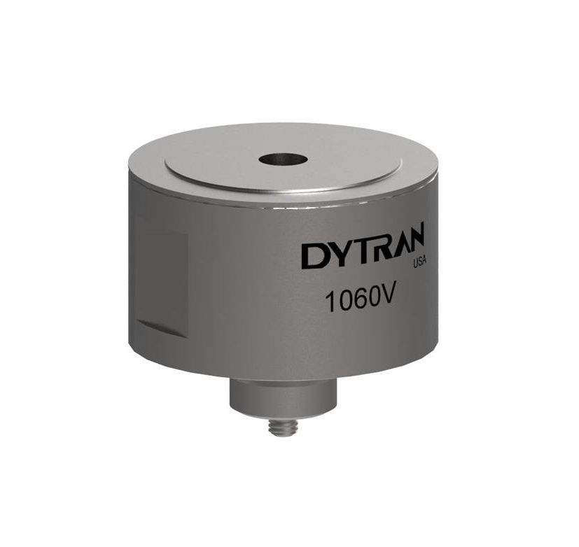 Dytran 1060V為壓縮結(jié)構(gòu)的石英晶體敏感元件,封裝于結(jié)構(gòu)堅固的不銹鋼外殼內(nèi),總重量為460克。該系列傳感器信號出線為10-32的徑向接頭,下端設(shè)有3/8-16的螺孔,安裝簡單方便。