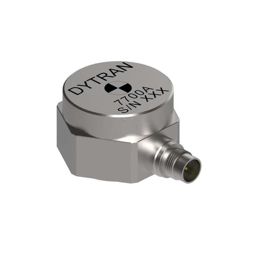 Dytran 7700系列高精度MEMS可變電容加速度傳感器,2.5-100 mV/g靈敏度,5-200 g量程,4針M4.5×0.35徑向連接器,通過10-32螺栓安裝,重量8克,-40-120°C操作溫度。