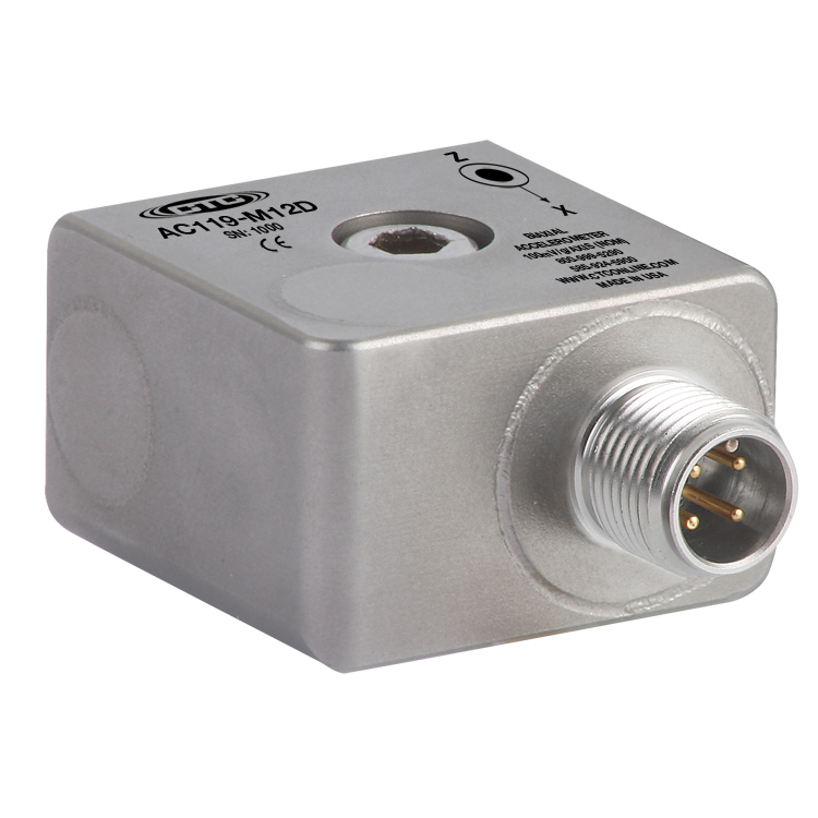 CTC AC119系列工業(yè)型雙軸加速度傳感器,100 mV/g靈敏度,量程±50 g,頻響1-6500 Hz,316L不銹鋼外殼材質(zhì),3針MIL M12連接器出線