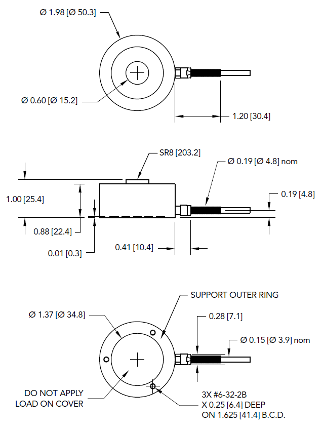 LLB500,66/88/133 kN量程,按鈕式測力傳感器,RoHS認證,底部#6-32安裝螺孔,材質(zhì) - 17-4 PH S.S.不銹鋼,#24 AWG 4芯編織屏蔽PVC電纜,長度3米